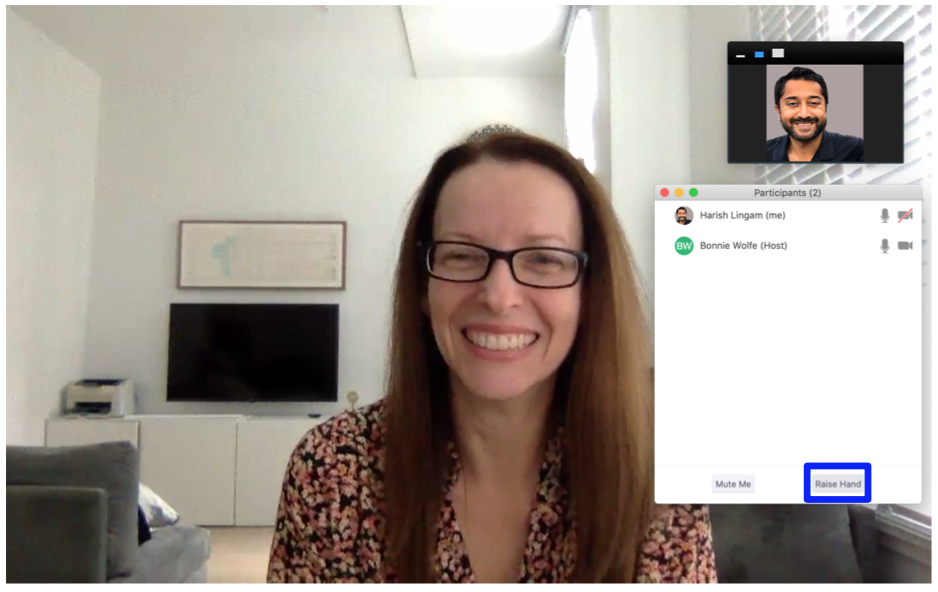 To raise your hand in Zoom: (1) Click the Participants button found in the control panel at the bottom of the Zoom window (2) Click “Raise Hand” found at the bottom of the chat window that appears.